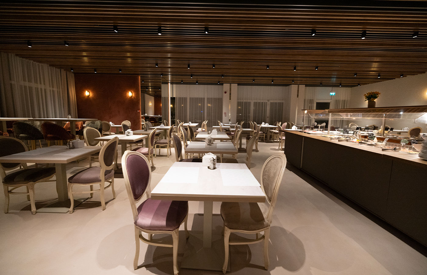 It offers you a warm buffet with a cold buffet and a fresh coffee for a perfect morning.